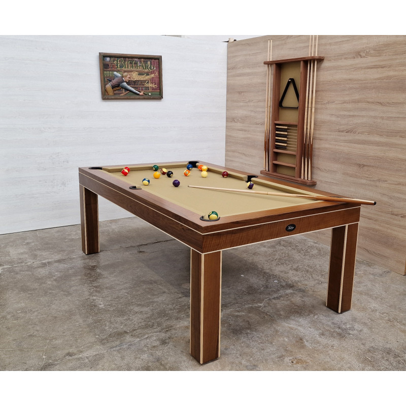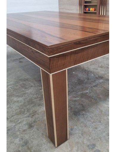 La table de billard Harmonie : 1er billard table moderne en NOYER MASSIF avec incrustation d’érable massif et ses poches cuir noir pour encore réhausser le niveau de qualité perçu.