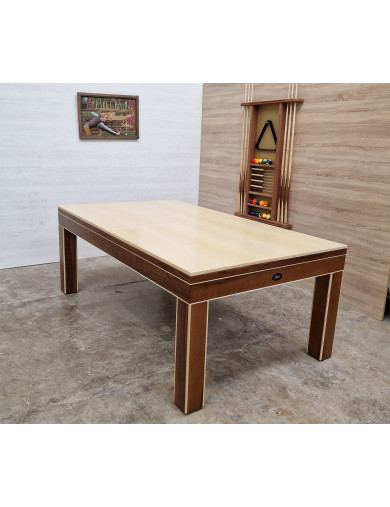 Au-delà du billard remarquez le travail du concept des meubles bicolores sur l’ensemble : Plateau table soit en noyer, soit en érable pour être transformé en bureau ou en table de salle à manger.